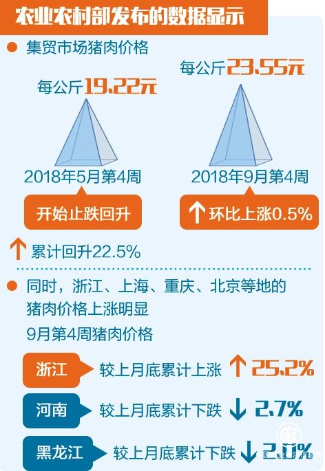 農業農村部發布的數據顯示,集貿市場生豬價格從2018年5月第3周每公斤10.35元開始止跌回升,8月第3周價格達到每公斤13.60元,第4周則回落至每公斤13.56元,之后繼續回升。從9月第2周開始連續3周保持平穩,9月份第4周環比漲0.1%,達到每公斤14.20元,累計回升37.2%。同時,浙江、上海、北京、重慶、福建生豬價格上漲明顯,9月第4周生豬價格較上月底分別累計上漲31.0%、16.5%、13.4%、13.1%和11.7%。河南、遼寧和吉林則分別累計下跌13.1%、5.1%和5.2%。