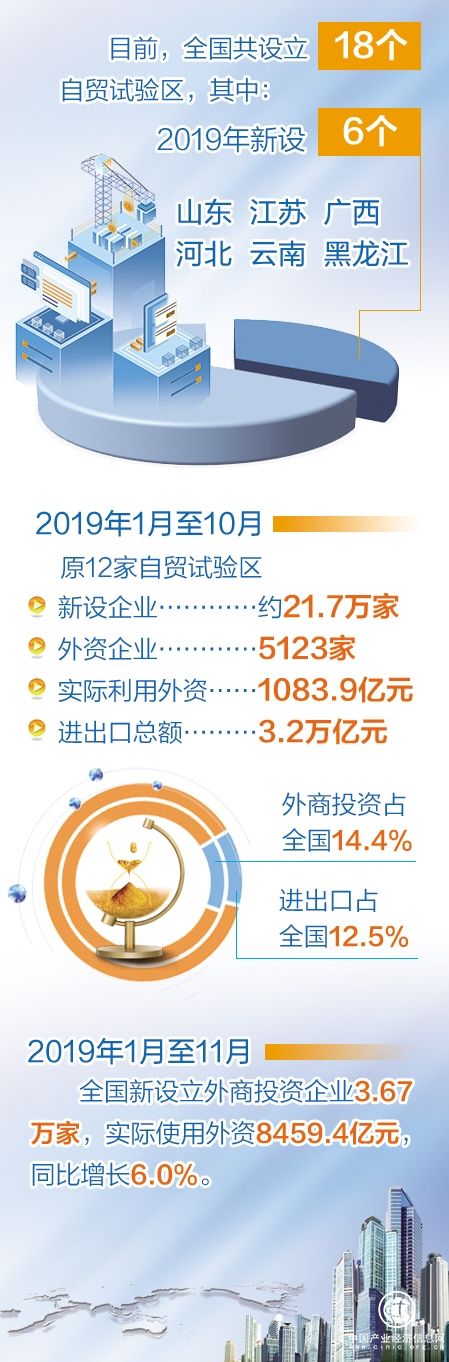 從2013年9月上海自貿試驗區正式掛牌成立,到2019年底“1+3+7+1+6”18個自貿試驗區全面鋪開,覆蓋東西南北中的自貿試驗區建設正推動我國擴大開放不斷深入。剛剛過去的2019年,新設山東、江蘇等6個自貿試驗區。商務部發布的數據顯示,2019年1月至10月,僅原12家自貿試驗區就新設企業約21.7萬家、外資企業5123家;實際利用外資1083.9億元,進出口總額3.2萬億元,以不到全國千分之四的國土面積,實現了占全國14.4%的外商投資和12.5%的進出口。
