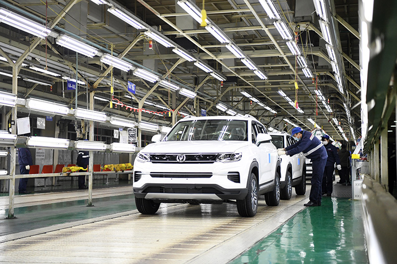 長安汽車渝北工廠車間內SUV汽車即將駛下生產線(2月18日攝)。新華社記者 唐奕 攝
