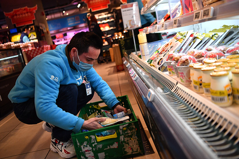 曹宏剛是云海肴餐飲管理有限公司位于西安一家門店的員工,目前他通過“共享員工”模式進入盒馬鮮生,在西安的營業點工作(2月6日攝)。新華社記者 張博文 攝
