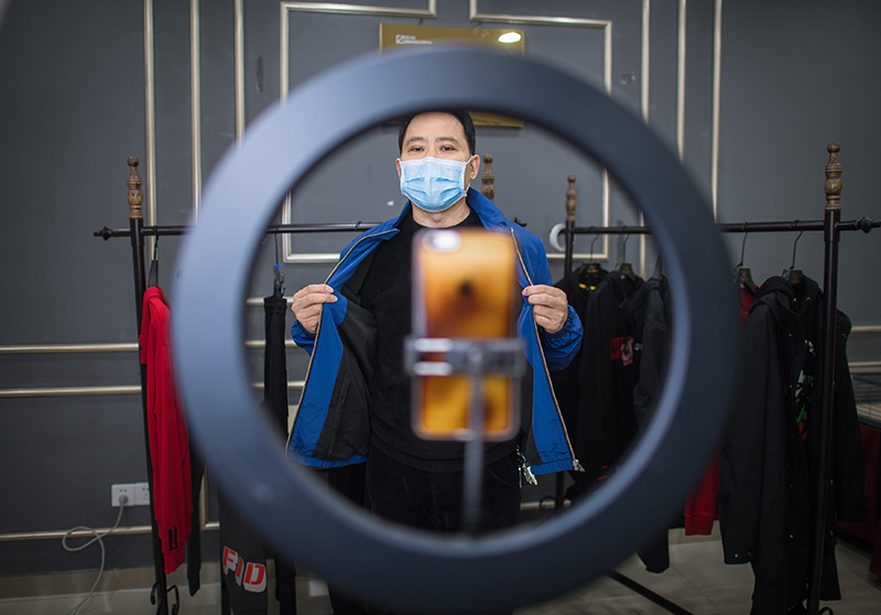 3月29日,在漢口北市場,一名主播在直播平臺直播銷售一款服裝。新華社記者 肖藝九 攝