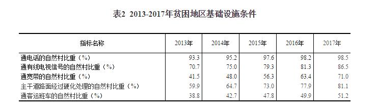 基礎設施條件不斷完善。截至2017年末,貧困地區通電的自然村接近全覆蓋;通電話的自然村比重達到98.5%,比2012年提高5.2個百分點;通有線電視信號的自然村比重為86.5%,比2012年提高17.5個百分點;通寬帶的自然村比重為71.0%,比2012年提高32.7個百分點。2017年貧困地區村內主干道路面經過硬化處理的自然村比重為81.1%,比2013年提高21.2個百分點;通客運班車的自然村比重為51.2%,比2013年提高12.4個百分點。