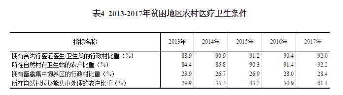 醫療衛生水平顯著提高。2017年,貧困地區農村擁有合法行醫證醫生或衛生員的行政村比重為92.0%,比2012年提高8.6個百分點;92.2%的戶所在自然村有衛生站,比2013年提高7.8個百分點;擁有畜禽集中飼養區的行政村比重為28.4%,比2012年提高12.4個百分點;61.4%的戶所在自然村垃圾能集中處理,比2013年提高31.5個百分點。