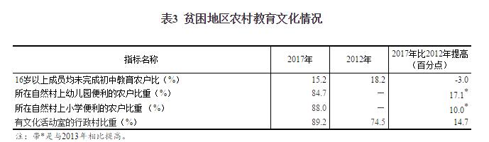 教育文化狀況明顯改善。2017年,貧困地區農村居民16歲以上家庭成員均未完成初中教育的農戶比重為15.2%,比2012年下降3.0個百分點;84.7%的農戶所在自然村上幼兒園便利,88.0%的農戶所在自然村上小學便利,分別比2013年提高17.1和10.0個百分點;有文化活動室的行政村比重為89.2%,比2012年提高14.7個百分點。