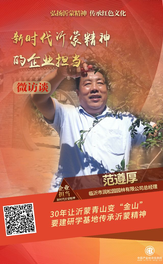 地處沂蒙山革命老區腹地的臨沂市沂南縣,群山環抱,三條大河穿流而過,有著豐富的自然生態資源。然而早年間由于地理條件等因素的制約,這里的百姓只能憑手中的幾畝薄田“靠天吃飯”,日子過得緊緊巴巴。范遵厚,這個土生土長的沂南漢子,憑著沂蒙人與生俱來的那股闖勁,白手起家,用30年的時間建起了年收入過億元的大型綠化工程企業,讓沂蒙山的綠化苗木在全國各地扎根開花。他還建立了苗木種植合作社,帶領周邊鄉村千余戶百姓共同“拔窮根”、奔小康,真正讓家鄉的綠水青山變成了“金山銀山”。近年來,作為山東省新的社會階層代表人士和沂蒙精神傳承促進會副會長,他又把工作的重心放到如何更好的宣傳弘揚沂蒙精神上來,組織沂蒙精神宣講進學校、進企業、進軍營活動百余場。“讓沂蒙精神更好傳承,影響更多的人”,這成了他新的奮斗目標。