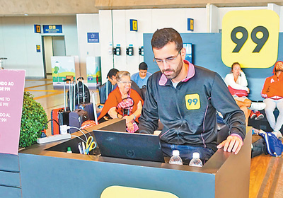 巴西里約熱內盧國際機場設有99公司服務區,供乘客在此叫車等候。圖為正在工作的99公司員工。(人民日報記者 張遠南 攝)