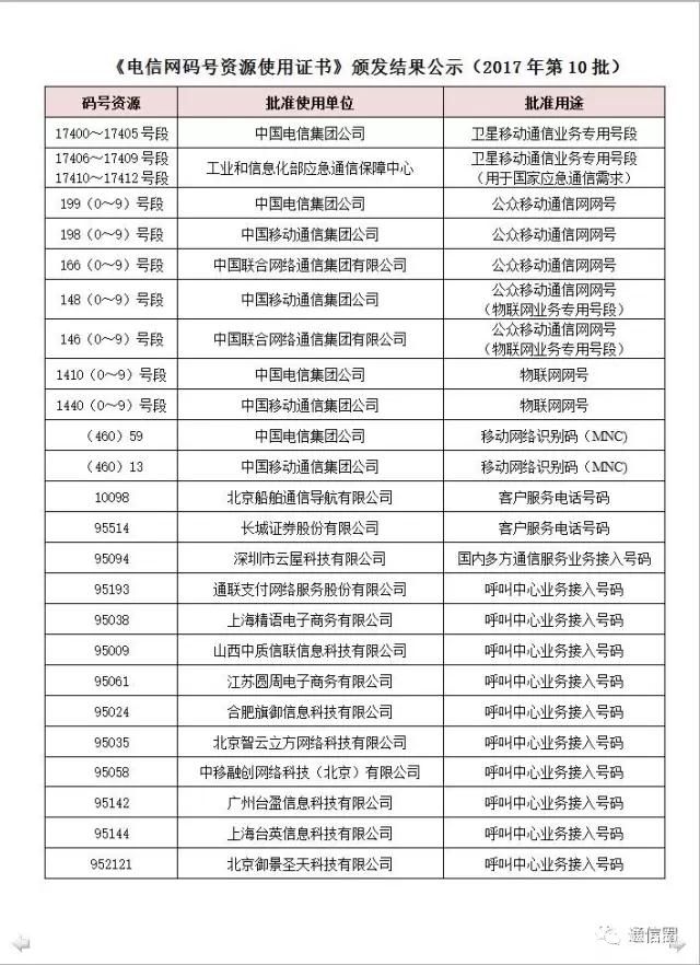 2017年第10批《電信網碼號資源使用證書》頒發結果公示及領證通知