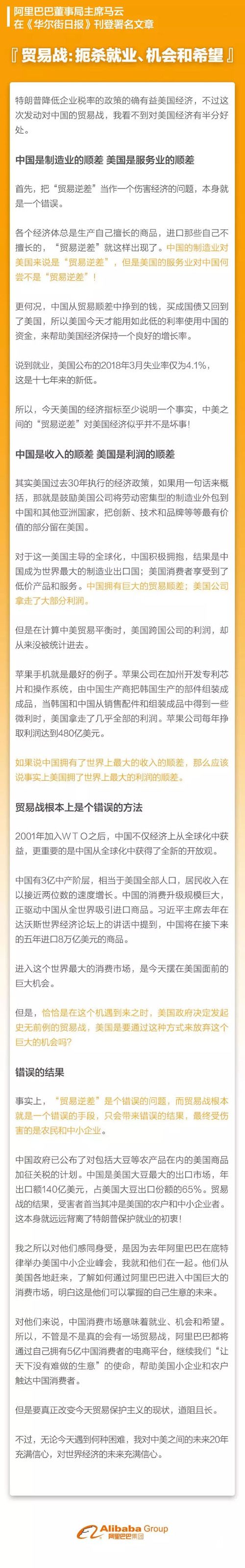 4月11日,《華爾街日報》刊發阿里巴巴董事局主席馬云署名文章——《貿易戰:扼殺就業、機會和希望》。在美國政府有意挑起貿易戰的背景下,馬云以致力于連接中美企業和市場的企業家視角展開論述:“貿易逆差”是個錯誤的問題,貿易戰是根本錯誤的手段,最終受傷害的是美國農戶和中小企業家。馬云向特朗普政府提出關鍵問題:美國是否要放棄進入中國這個全球最大消費市場的巨大歷史機會?