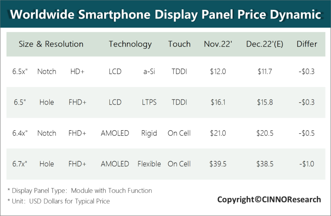 CINNO Research 預測,在需求沒有明顯利好因素的情況下,智能手機面板價格將持續走低,2022 年 12 月和 2023 年 1 月 a-Si / LTPS 面板價格將每月下降 0.3 美元;剛性 AMOLED 面板價格將繼續下降 0.5 美元;柔性 AMOLED 面板價格或將下降 1 美元。