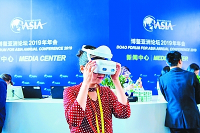 3月26日,媒體記者在博鰲亞洲論壇新聞中心體驗“5G+4K+VR”高清直播。光明圖片/視覺中國