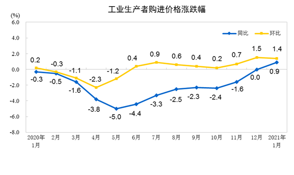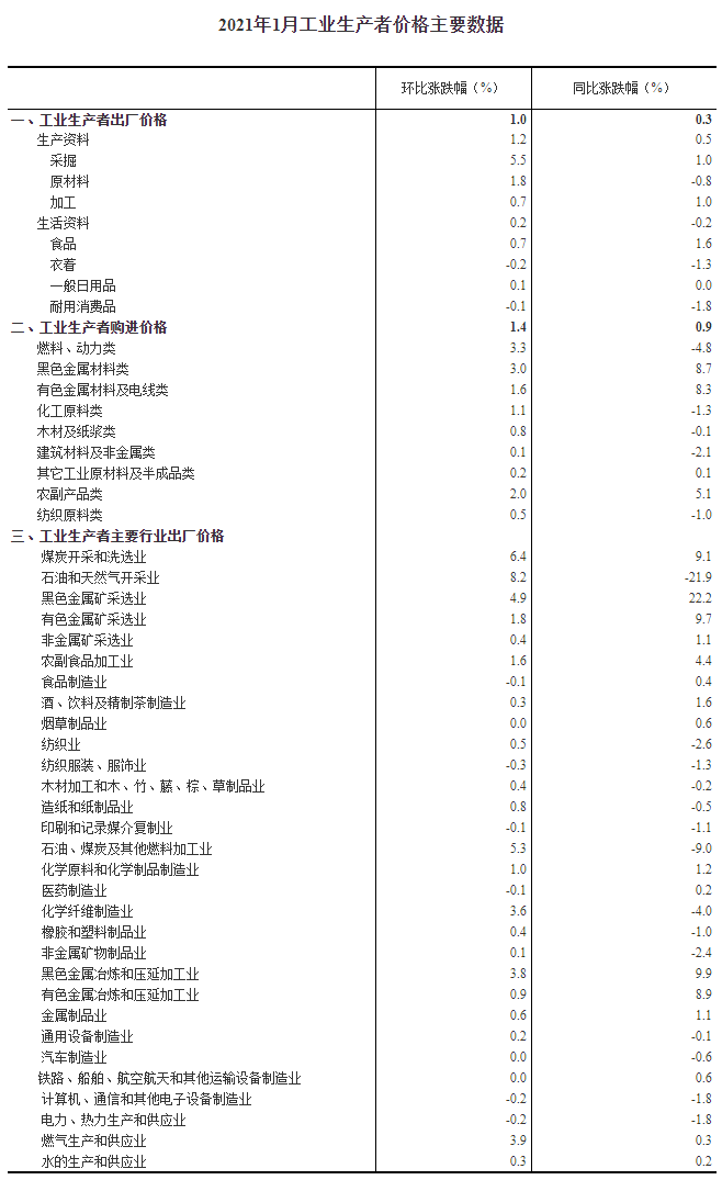 2021年1月份,全國工業生產者出廠價格同比上漲0.3%,環比上漲1.0%;工業生產者購進價格同比上漲0.9%,環比上漲1.4%。