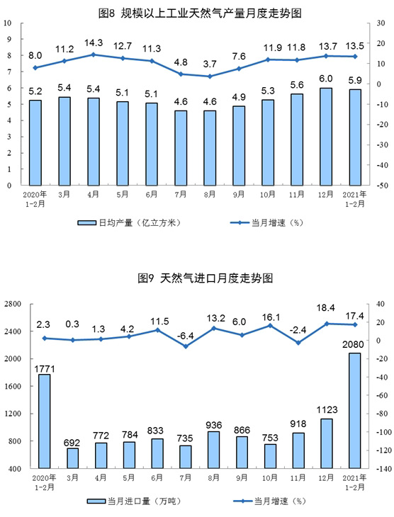天然氣生產同比較快增長,日均環比保持穩定。1—2月份,生產天然氣348億立方米,同比增長13.5%,比2019年1—2月份增長22.5%,兩年平均增長10.7%;日均產量5.9億立方米,比上年12月份減少0.1億立方米。進口天然氣2080萬噸,同比增長17.4%。