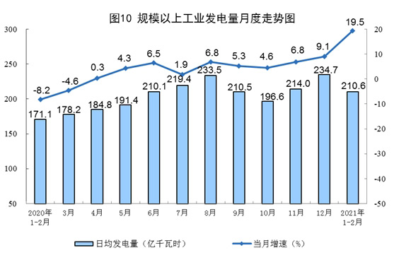 電力生產同比增長較快,兩年年均平穩增長,日均環比有所回落。1—2月份,發電量12428億千瓦時,同比增長19.5%,比2019年1—2月份增長9.7%,兩年平均增長4.7%;日均發電210.6億千瓦時,比上年12月份減少24.1億千瓦時。