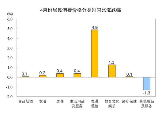 4月份,全國居民消費價格環比下降0.3%。其中,城市下降0.2%,農村下降0.5%;食品價格下降2.4%,非食品價格上漲0.2%;消費品價格下降0.7%,服務價格上漲0.4%。