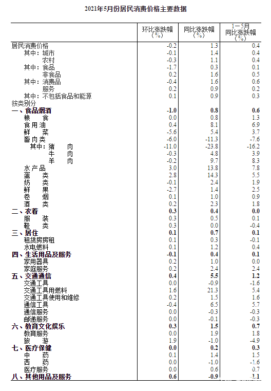 2021年5月份,全國居民消費價格同比上漲1.3%。其中,城市上漲1.4%,農村上漲1.1%;食品價格上漲0.3%,非食品價格上漲1.6%;消費品價格上漲1.6%,服務價格上漲0.9%。1--—5月平均,全國居民消費價格比去年同期上漲0.4%。
