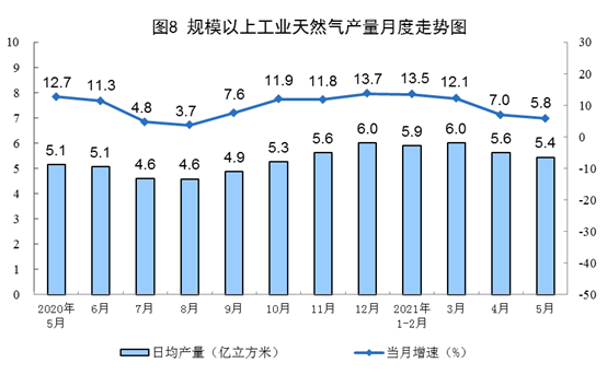 天然氣生產基本穩定。5月份,生產天然氣169億立方米,同比增長5.8%,比2019年同期增長19.2%,兩年平均增長9.2%,日均產量5.4億立方米。