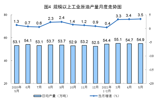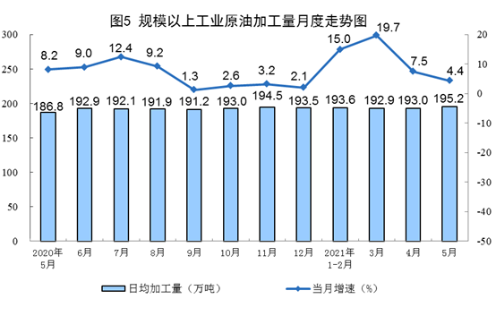 原油生產平穩,加工量保持增長。5月份,生產原油1703萬噸,同比增長3.5%,比2019年同期增長4.8%,兩年平均增長2.4%,日均產量54.9萬噸。加工原油6050萬噸,同比增長4.4%,比2019年同期增長12.9%,兩年平均增長6.2%,日均加工195.2萬噸。
