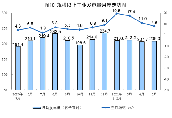 電力生產增速有所回落。5月份,發電6478億千瓦時,同比增長7.9%,比2019年同期增長12.6%,兩年平均增長6.1%,日均發電209億千瓦時。1—5月份,發電31772億千瓦時,同比增長14.9%,比2019年同期增長11.3%,兩年平均增長5.5%。
