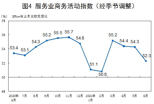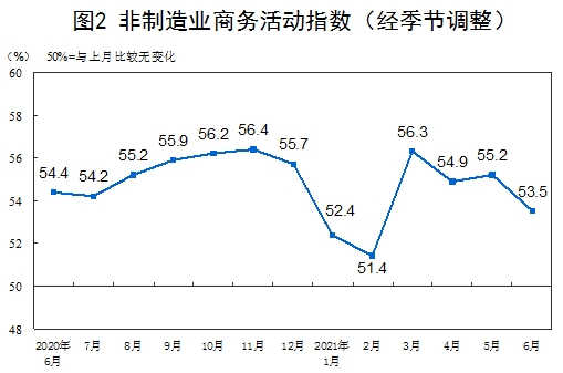 6月份,非制造業商務活動指數為53.5%,較上月回落1.7個百分點,非制造業擴張力度有所減弱。