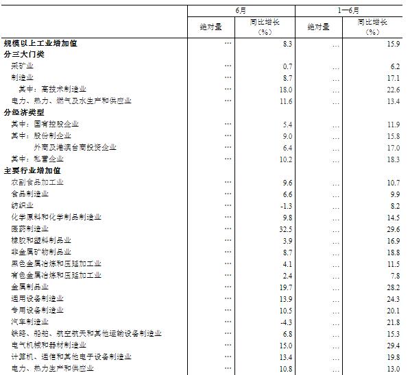 6月份,規模以上工業增加值同比實際增長8.3%(以下增加值增速均為扣除價格因素的實際增長率),比2019年同期增長13.5%,兩年平均增長6.5%。從環比看,6月份,規模以上工業增加值比上月增長0.56%。1—6月份,規模以上工業增加值同比增長15.9%,兩年平均增長7.0%。