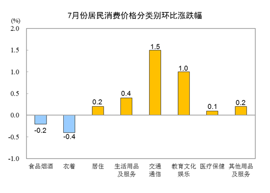 7月份,全國居民消費價格環比上漲0.3%。其中,城市上漲0.3%,農村上漲0.2%;食品價格下降0.4%,非食品價格上漲0.5%;消費品價格上漲0.1%,服務價格上漲0.6%。