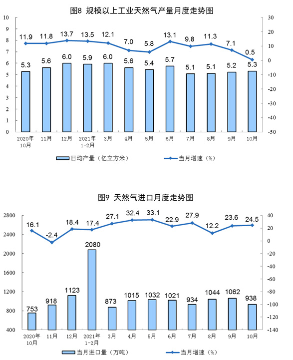 天然氣生產增速回落。10月份,生產天然氣165億立方米,同比增長0.5%,增速比上月回落6.6個百分點,比2019年同期增長12.4%,兩年平均增長6.0%,日均產量5.3億立方米。