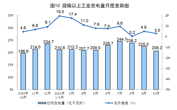 電力生產保持增長。10月份,發電6393億千瓦時,同比增長3.0%,增速比上月回落1.9個百分點,比2019年同期增長7.7%,兩年平均增長3.8%,日均發電206億千瓦時。1—10月份,發電67176億千瓦時,同比增長10.0%,比2019年同期增長11.5%,兩年平均增長5.6%。
