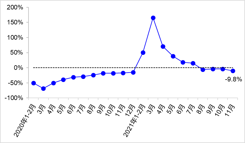 11月,完成營業性客運量5.4億人,同比下降41.1%,兩年平均下降37.0%、降幅較10月擴大5.4個百分點。其中,完成公路營業性客運量3.7億人,同比下降43.3%;完成水路客運量969萬人,同比下降33.7%。