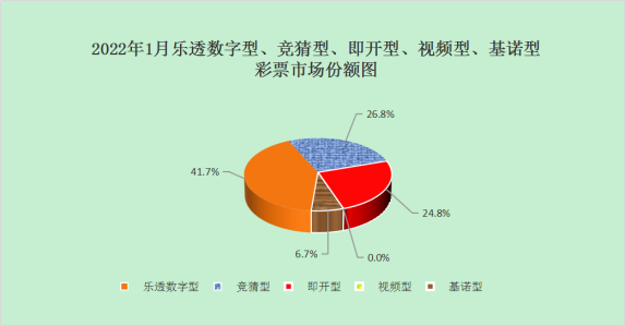 受高頻快開彩票游戲退市、即開型彩票派獎促銷、基諾型彩票擴大銷售范圍等因素影響,1月份主要彩票品種銷量同比波動較大。樂透數字型彩票銷售128.65億元,同比減少90.70億元,下降41.4%;競猜型彩票銷售82.45億元,同比減少6.37億元,下降7.2%;即開型彩票銷售76.53億元,同比增加36.07億元,增長89.2%;視頻型彩票銷售0.0005億元,同比減少0.0014億元,下降72.6%;基諾型彩票銷售20.59億元,同比增加11.64億元,增長130.1%。1月份,樂透數字型、競猜型、即開型、基諾型彩票銷售量分別占彩票銷售總量的41.7%、26.8%、24.8%、6.7%,視頻型彩票銷售占比不到0.1%。