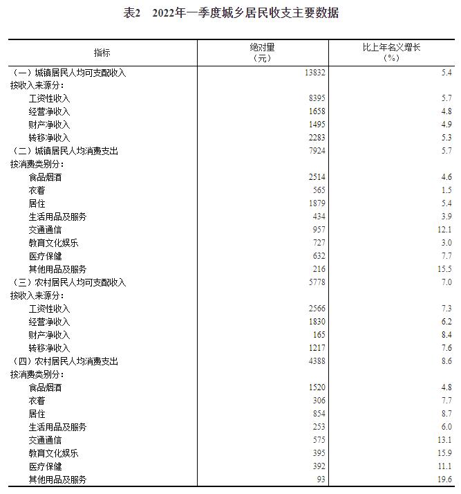 一季度,全國居民人均可支配收入10345元,比上年名義增長6.3%,扣除價格因素,實際增長5.1%。分城鄉看,城鎮居民人均可支配收入13832元,增長(以下如無特別說明,均為同比名義增長)5.4%,扣除價格因素,實際增長4.2%;農村居民人均可支配收入5778元,增長7.0%,扣除價格因素,實際增長6.3%。