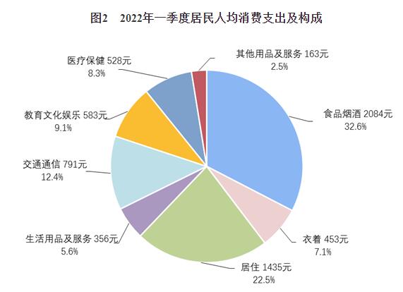 一季度,全國居民人均食品煙酒消費支出2084元,增長4.9%,占人均消費支出的比重為32.6%;人均衣著消費支出453元,增長3.6%,占人均消費支出的比重為7.1%;人均居住消費支出1435元,增長6.7%,占人均消費支出的比重為22.5%;人均生活用品及服務消費支出356元,增長4.8%,占人均消費支出的比重為5.6%;人均交通通信消費支出791元,增長12.7%,占人均消費支出的比重為12.4%;人均教育文化娛樂消費支出583元,增長6.9%,占人均消費支出的比重為9.1%;人均醫療保健消費支出528元,增長9.1%,占人均消費支出的比重為8.3%;人均其他用品及服務消費支出163元,增長17.1%,占人均消費支出的比重為2.5%。