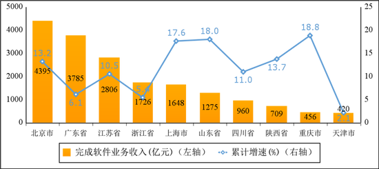 主要軟件大省業務收入占比小幅下降。一季度,軟件業務收入居前5名的省份中,北京市、廣東省、江蘇省、浙江省、上海市軟件收入分別為4395億元、3785億元、2806億元、1726億元和1648億元,分別增長13.2%、6.1%、10.5%、5.4%和17.6%,五省(市)合計軟件業務收入14360億元,占全國比重為71.6%,占比較去年同期回落0.8個百分點。