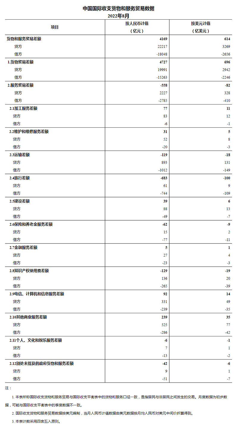 按美元計值,2022年8月,我國國際收支貨物和服務貿易出口3269億美元,進口2656億美元,順差614億美元。