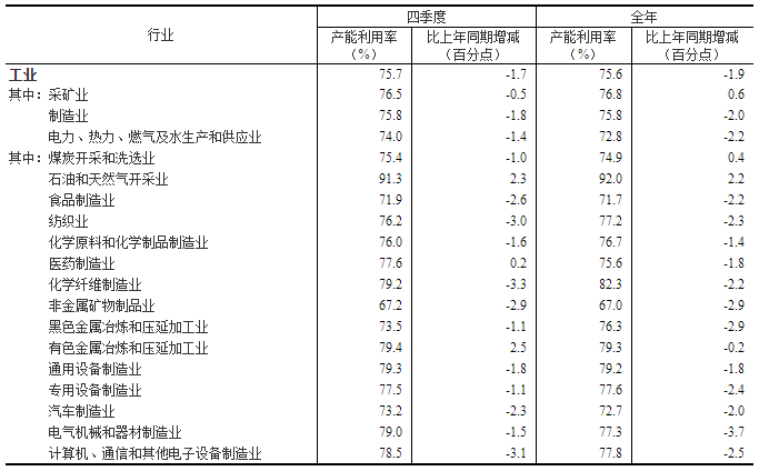 分三大門類看,四季度,采礦業產能利用率為76.5%,比上年同期下降0.5個百分點;制造業產能利用率為75.8%,下降1.8個百分點;電力、熱力、燃氣及水生產和供應業產能利用率為74.0%,下降1.4個百分點。