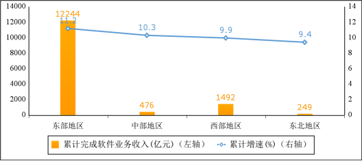 東北部地區軟件業收入加快增長,東部地區增勢突出。1—2月份,東部地區完成軟件業務收入12244億元,同比增長11.2%,高出全行業整體水平0.2個百分點;中部地區完成軟件業務收入476億元,同比增長10.3%;西部地區完成軟件業務收入1492億元,同比增長9.9%;東北地區完成軟件業務收入249億元,同比增長9.4%。四個地區軟件業務收入在全國總收入中的占比分別為84.7%、3.3%、10.3%和1.7%。