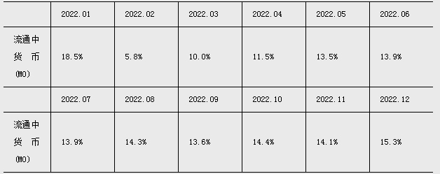 注4:自2022年12月起,“流通中貨幣(M0)”含流通中數字人民幣。12月末流通中數字人民幣余額為136.1億元。修訂后,2022年各月末M1、M2增速無明顯變化。修訂后M0增速如下: