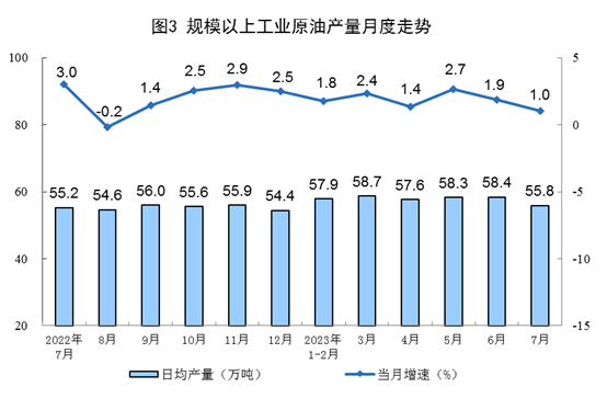 原油產量小幅增加,進口保持較快增長。7月份,生產原油1731萬噸,同比增長1.0%,增速比6月份放緩0.9個百分點,日均產量55.8萬噸。進口原油4369萬噸,同比增長17.0%,增速比6月份回落28.4個百分點。