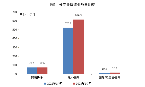 1—7月,同城快遞業務量累計完成72.6億件,同比下降0.7%;異地快遞業務量累計完成614.3億件,同比增長17.0%;國際/港澳臺快遞業務量累計完成16.1億件,同比增長57.2%。