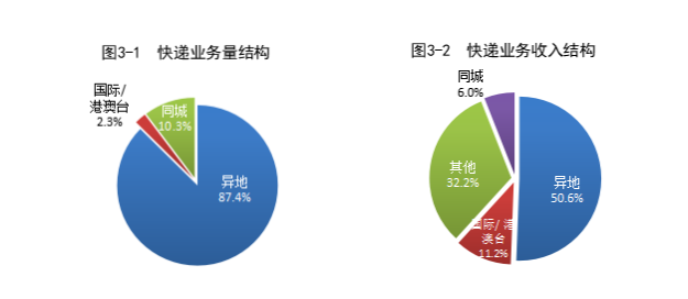 1—7月,同城、異地、國際/港澳臺快遞業務量分別占全部快遞業務量的10.3%、87.4%和2.3%;業務收入分別占全部快遞收入的6.0%、50.6%和11.2%。與去年同期相比,同城快遞業務量的比重下降1.7個百分點,異地快遞業務量的比重上升1.1個百分點,國際/港澳臺業務量的比重上升0.6個百分點。