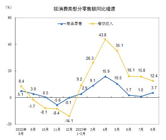 按消費類型分,8月份,商品零售33721億元,同比增長3.7%;餐飲收入4212億元,增長12.4%。1—8月份,商品零售269463億元,同比增長5.6%;餐飲收入32818億元,增長19.4%。