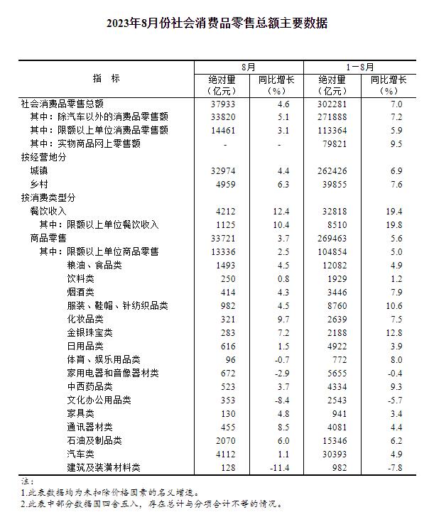 8月份,社會消費品零售總額37933億元,同比增長4.6%。其中,除汽車以外的消費品零售額33820億元,增長5.1%。