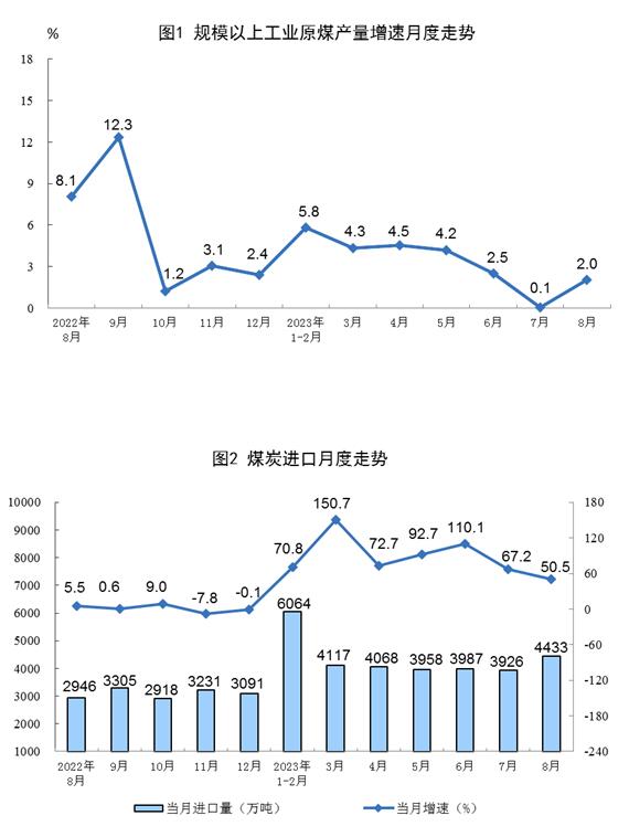 原煤生產有所加快,進口保持快速增長。8月份,生產原煤3.8億噸,同比增長2.0%,增速比7月份加快1.9個百分點,日均產量1233萬噸。進口煤炭4433萬噸,同比增長50.5%,增速比7月份回落16.7個百分點。