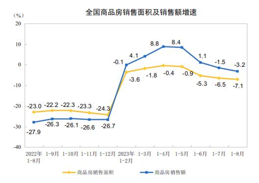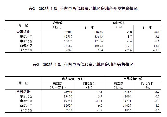 1—8月份,全國房地產開發投資76900億元,同比下降8.8%(按可比口徑計算,詳見附注6);其中,住宅投資58425億元,下降8.0%。