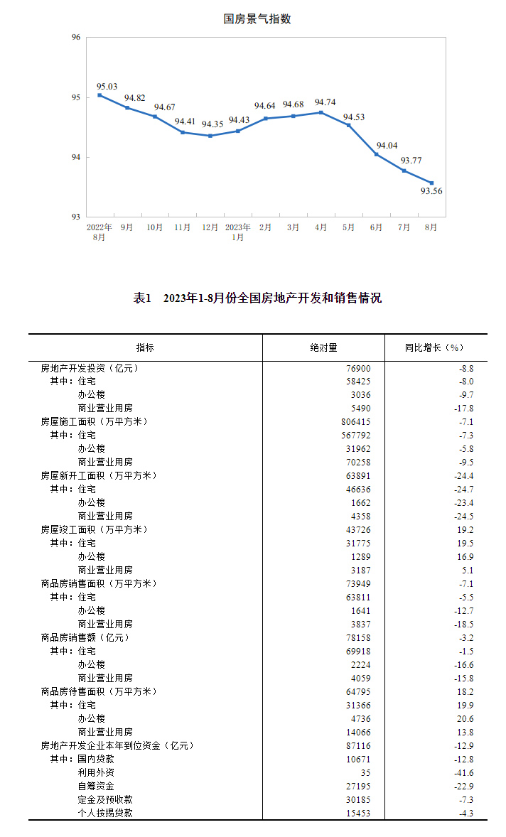 8月份,房地產開發景氣指數(簡稱“國房景氣指數”)為93.56。