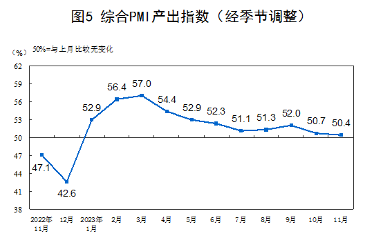 11月份,綜合PMI產出指數為50.4%,比上月下降0.3個百分點,表明我國企業生產經營活動總體持續擴張。