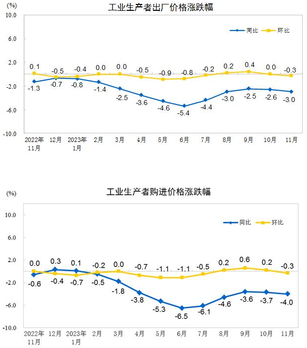 2023年11月份,全國工業生產者出廠價格同比下降3.0%,環比下降0.3%;工業生產者購進價格同比下降4.0%,環比下降0.3%。1—11月平均,工業生產者出廠價格比上年同期下降3.1%,工業生產者購進價格下降3.6%。