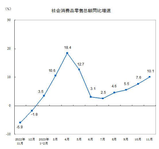 11月份,社會消費品零售總額42505億元,同比增長10.1%。其中,除汽車以外的消費品零售額38191億元,增長9.6%。