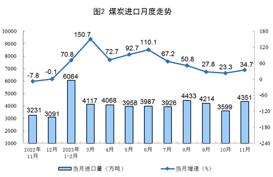 原煤生產有所加快,進口較快增長。11月份,生產原煤4.1億噸,同比增長4.6%,增速比10月份加快0.8個百分點,日均產量1379.9萬噸。進口煤炭4351萬噸,同比增長34.7%,增速比10月份加快11.4個百分點。