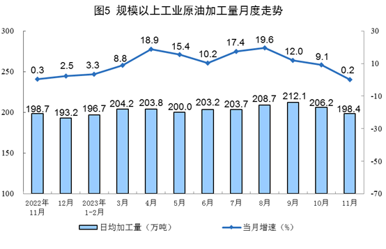 原油加工保持增長。11月份,加工原油5953萬噸,同比增長0.2%,增速比10月份回落8.9個百分點,日均加工原油198.4萬噸。1—11月份,加工原油67622萬噸,同比增長10.1%。