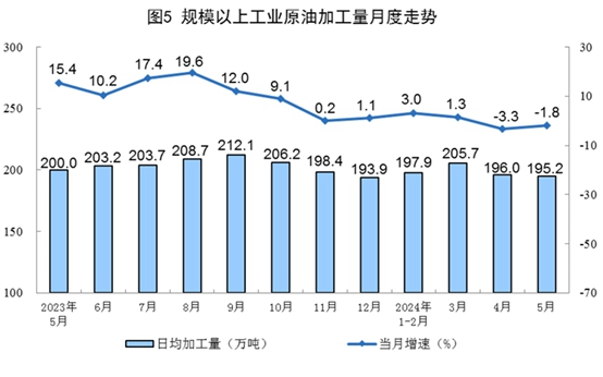 原油加工降幅收窄。5月份,規上工業原油加工量6052萬噸,同比下降1.8%,降幅比4月份收窄1.5個百分點;日均加工195.2萬噸。1—5月份,規上工業原油加工量30177萬噸,同比增長0.3%。